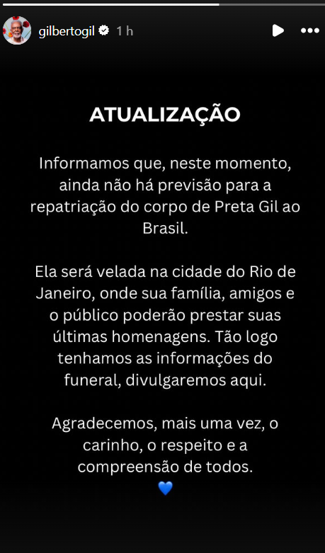 Preta Gil faleceu no último domingo (20), nos Estados Unidos, onde estava em tratamento experimental contra o câncer. A cantora havia tornado o diagnóstico público em 2023.